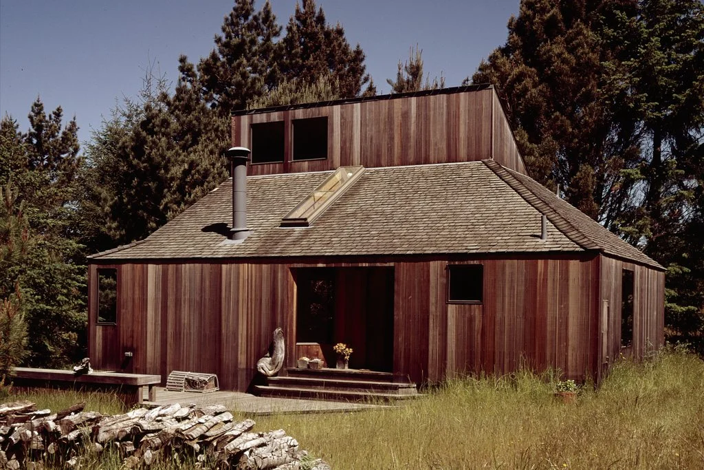 A modest cabin for a young couple, placed against the trees, allowing for an open meadow on the leeward side of the site.